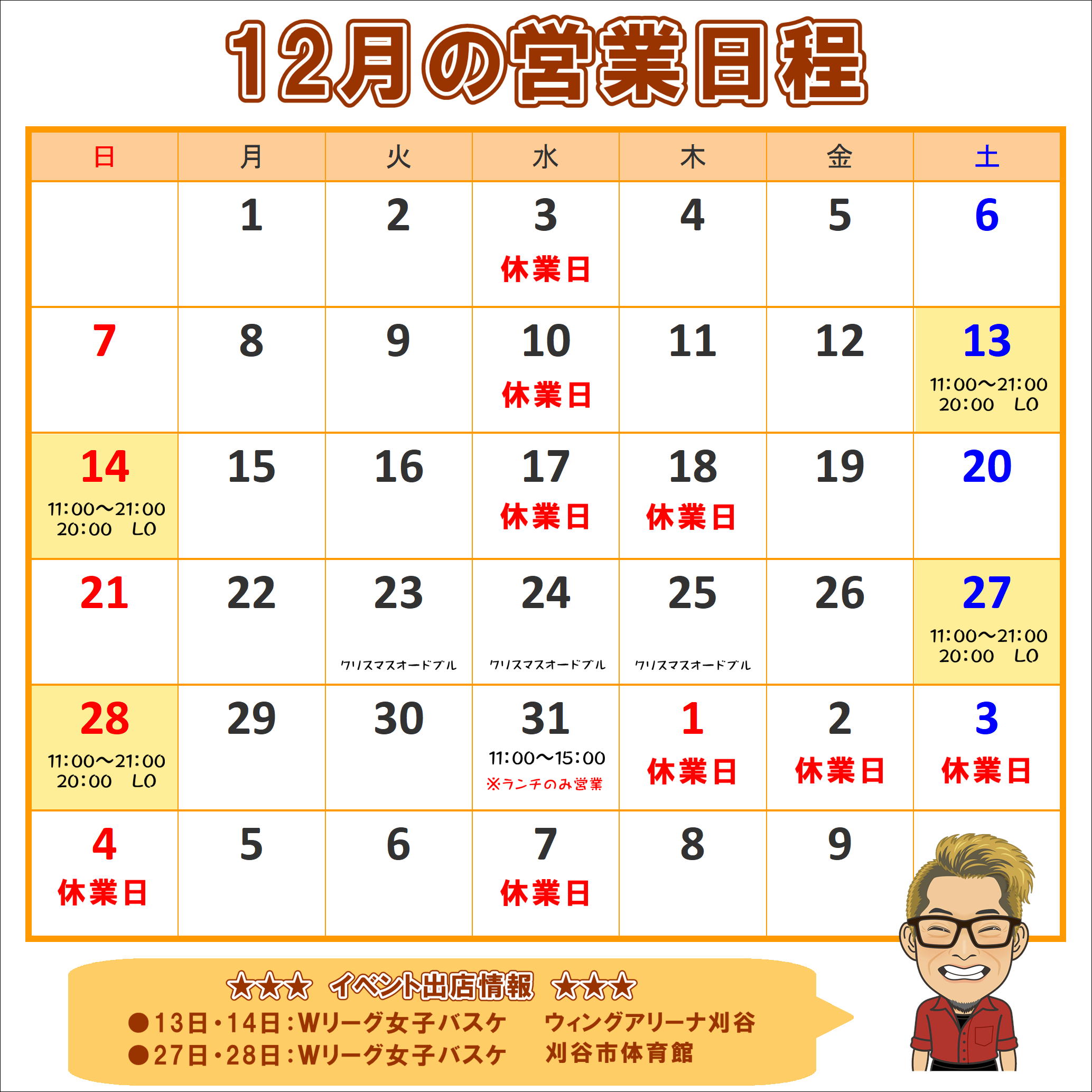いつもご来店いただきありがとうざいます。急に寒くなり体調崩されてませんか?今年も残すところ1ヵ月。12月、年末年始の営業予定です。クリスマスオードブル、忘年会、新年会のご予約も承っております。皆様のご利用お待ちしております。